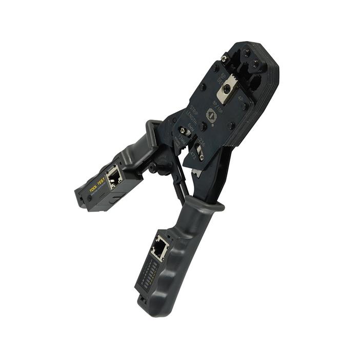 Tester de Red Remoto Integrado: El mango oculta un tester LED que se puede extraer. Esto permite probar cables ya instalados (dejando una parte en un extremo y llevando la pinza al otro) para verificar pin por pin (1 al 8 y G).